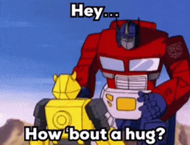 Optimus Prime Hugging Bumblebee GIF