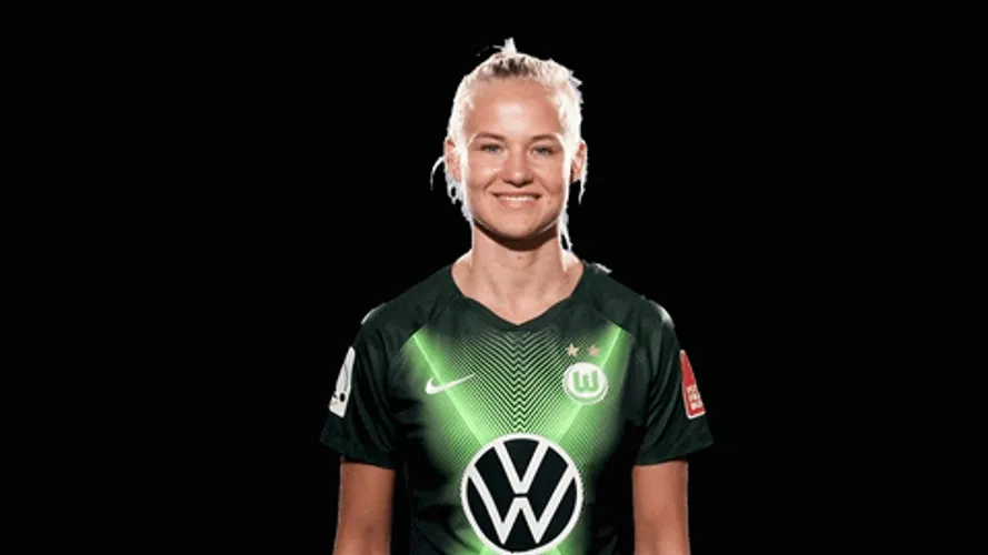 Footballer Pernille Harder smiling while doing the peace sign pose.